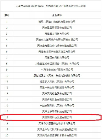 同陽(yáng)科技入選“天津市濱海新區(qū)2019年第一批戰(zhàn)略性新興產(chǎn)業(yè)領(lǐng)軍企業(yè)”