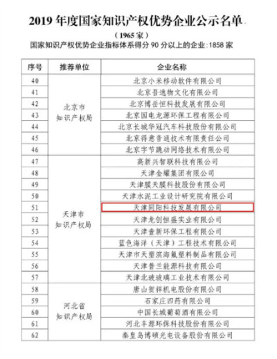 同陽(yáng)科技入選“2019年度國(guó)家知識(shí)產(chǎn)權(quán)優(yōu)勢(shì)企業(yè)公示名單”